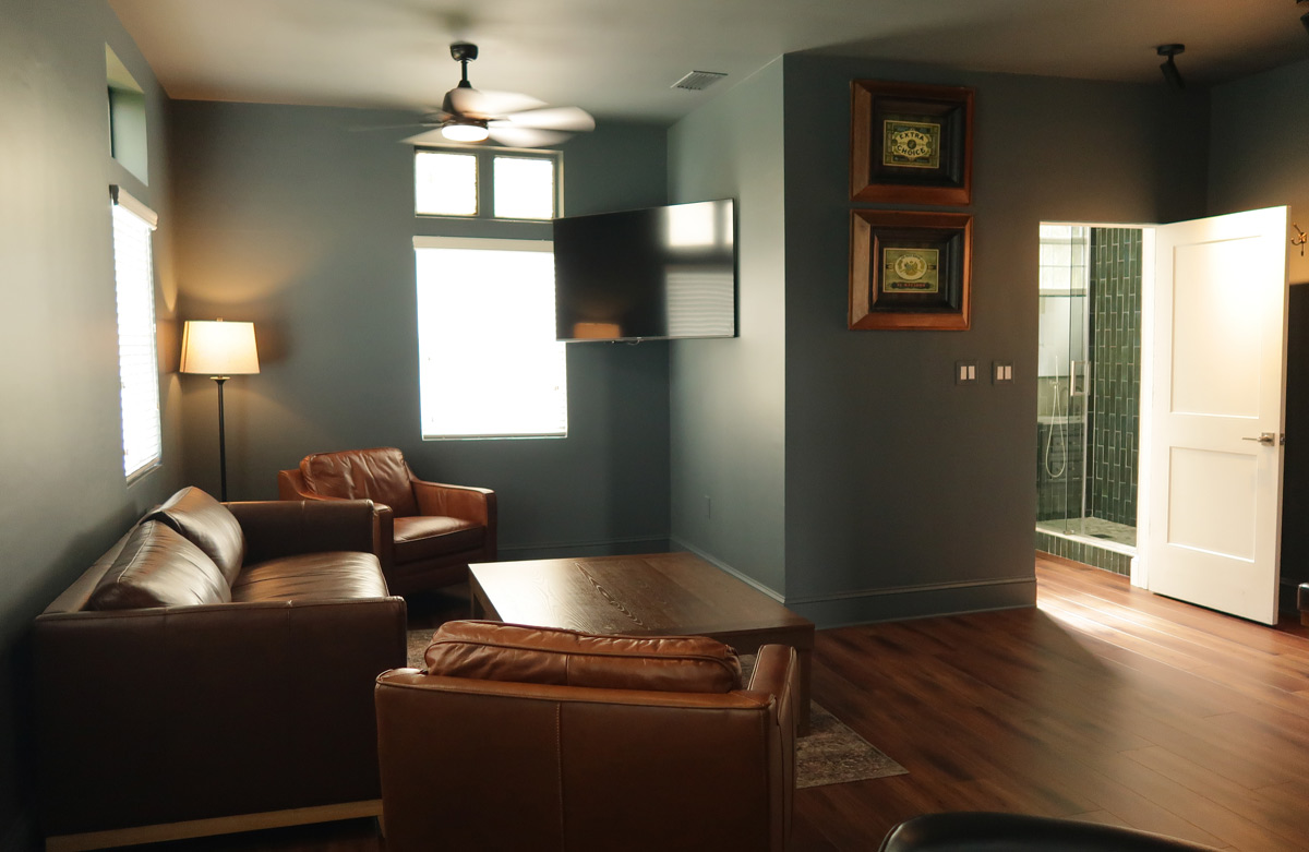 Your chic pre-celebration retreat, blending relaxed luxury with a polished Italian vibe. Sink into soft brown leather sofas, gather around the poker table for some friendly competition, and enjoy the convenience of a sleek private bathroom. It is the perfect spot to sip, laugh, and unwind with your favorite people before the festivities begin. A stylish start to an unforgettable day. Click here to see a video of the space.